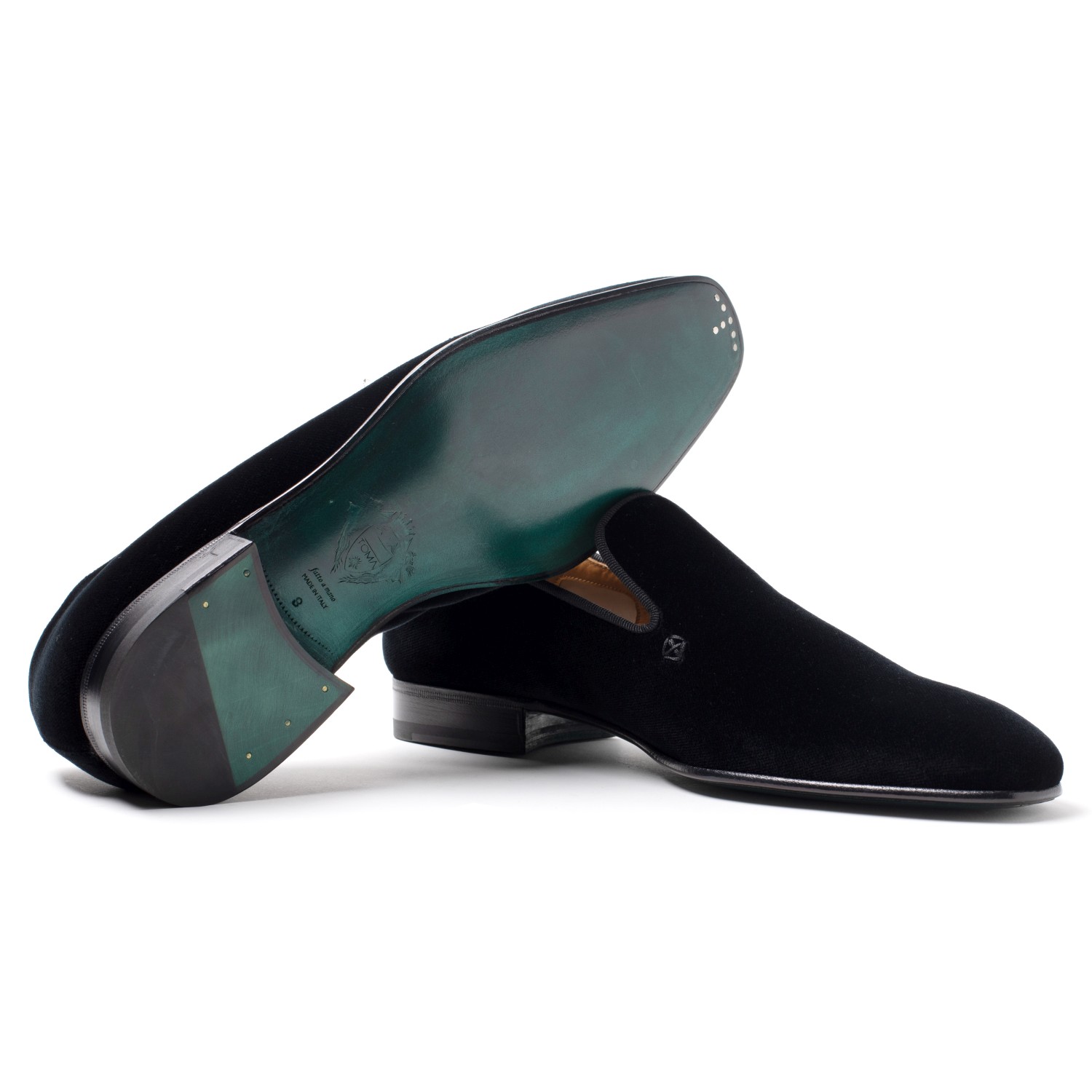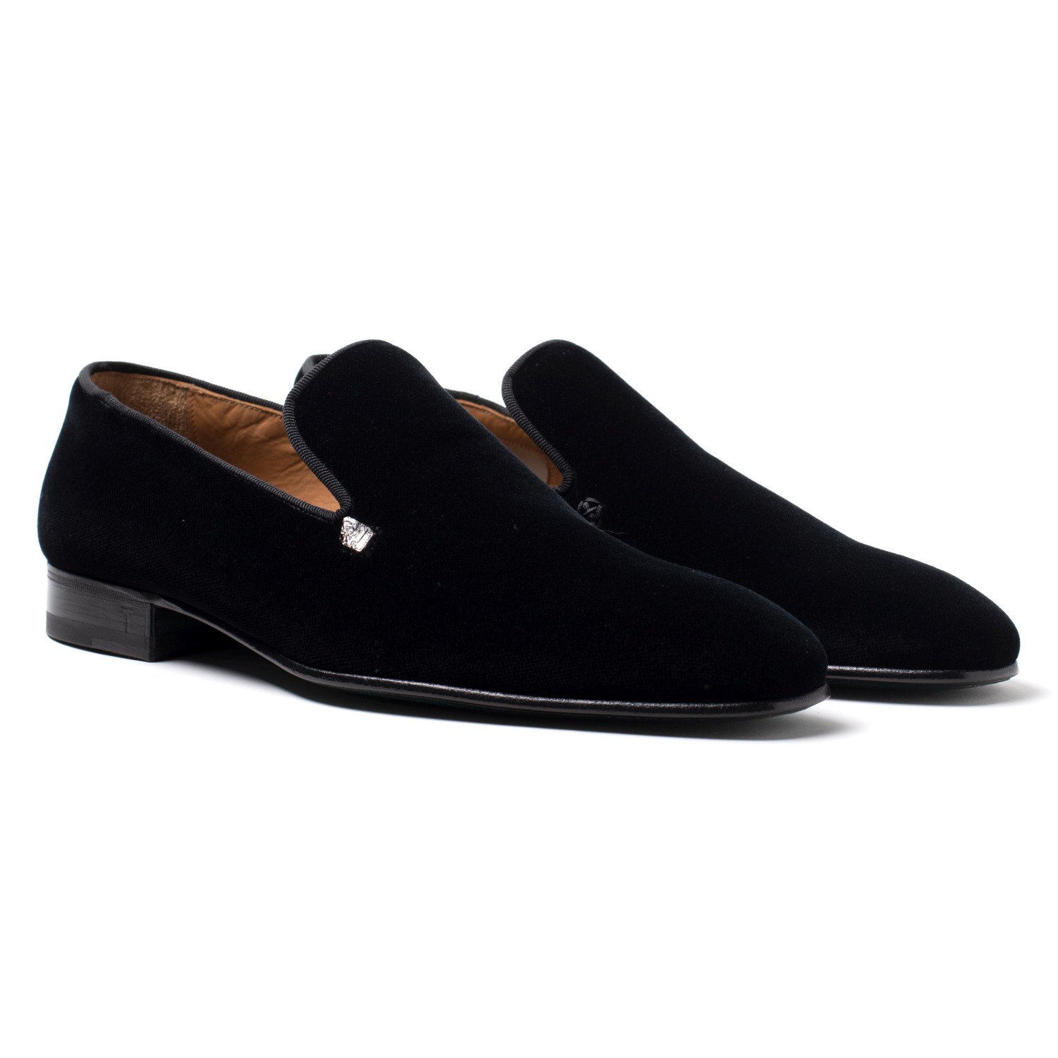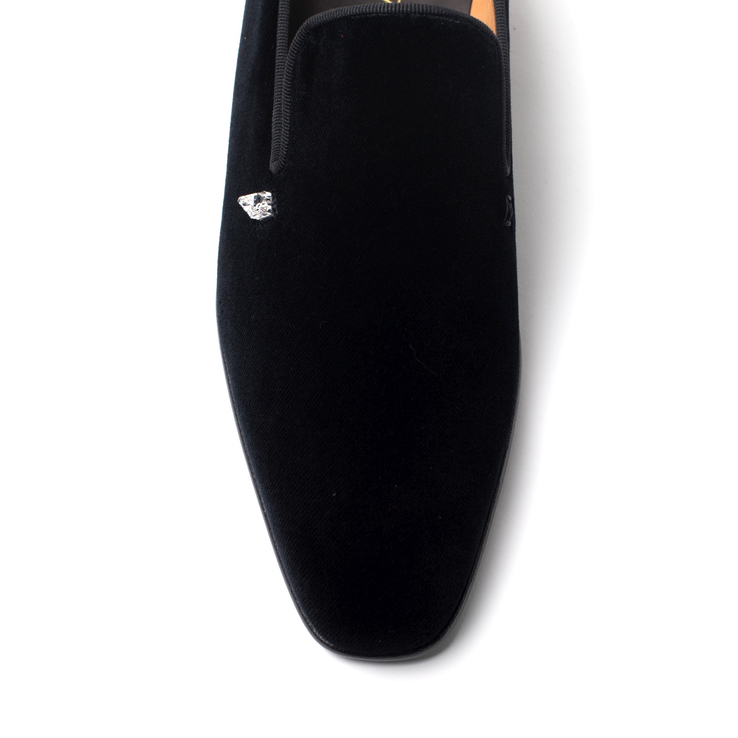 Mocassini da sera senza tempo. Realizzati in pregiato velluto foderato in nappa di vitello. Rifiniti con un importante dettaglio un cristallo Swarovski a taglio piramidale.