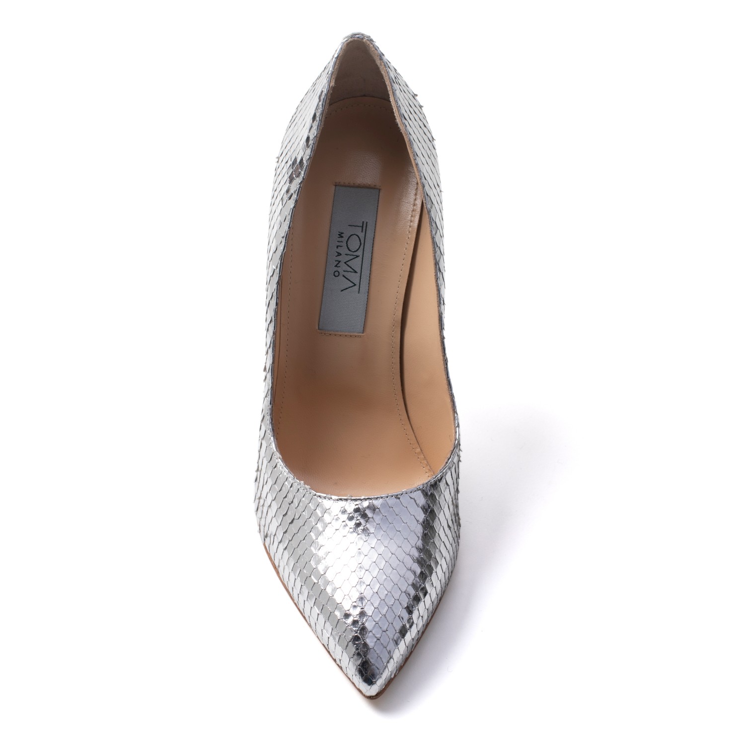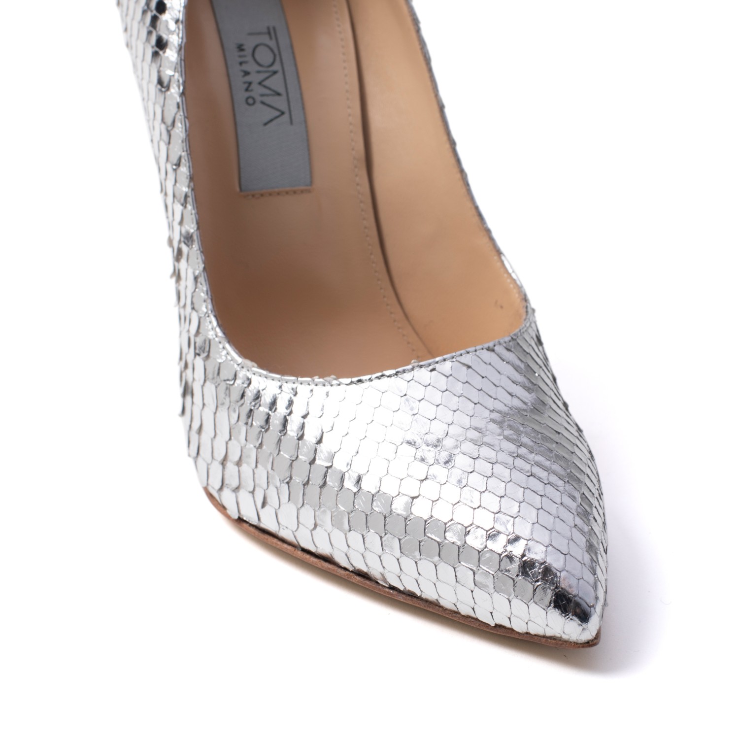 Décolleté classica in pregiata pelle di pitone con punta sfilata presenta un tacco a spillo ricoperto. Il raffinato modello è caratterizzato da una sinuosa bellezza senza tempo. Made in Italy