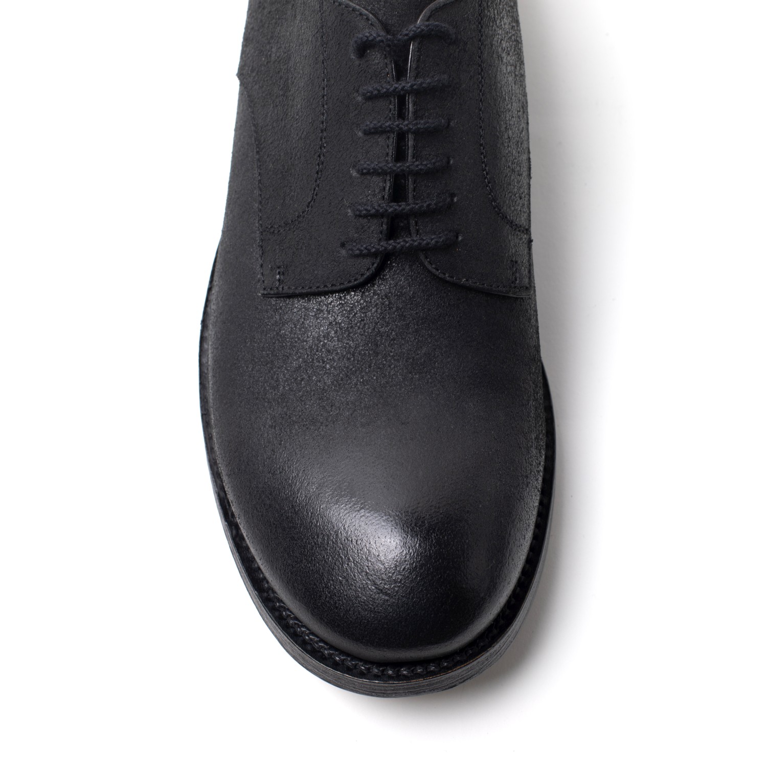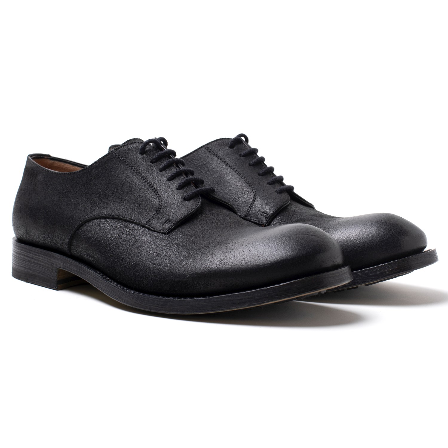 Derby realizzato in pelle di cammello resinata colore nero. Una calzatura moderna di grande struttura realizzato rigorosamente a mano. Lavorazione Blake. Rifinito con fondo in cuoio doppio e gomma. Dandy per intenditori. Made in Italy.