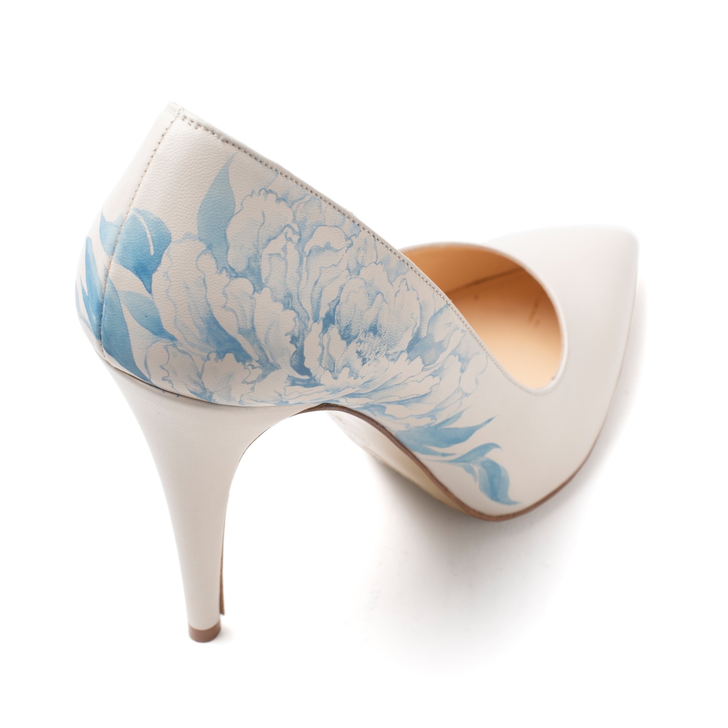 Décolleté dipinta a mano dall’artista giapponese Shoko Okumura “peonia” inchiostro blu. Tacco a spillo di 105 mm con una punta affusolata senza tempo.Ottima ergonomica e proporzioni ideali. Made in Italy
