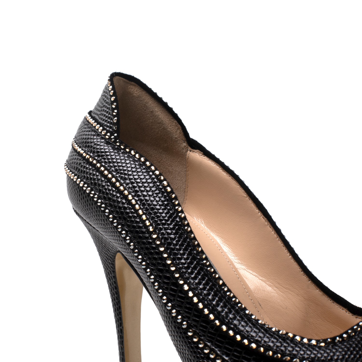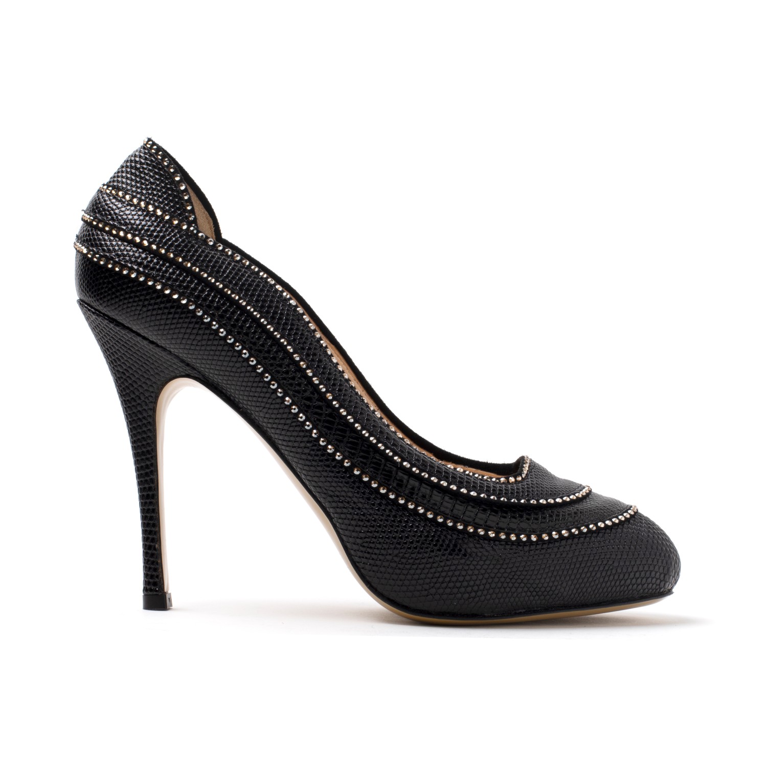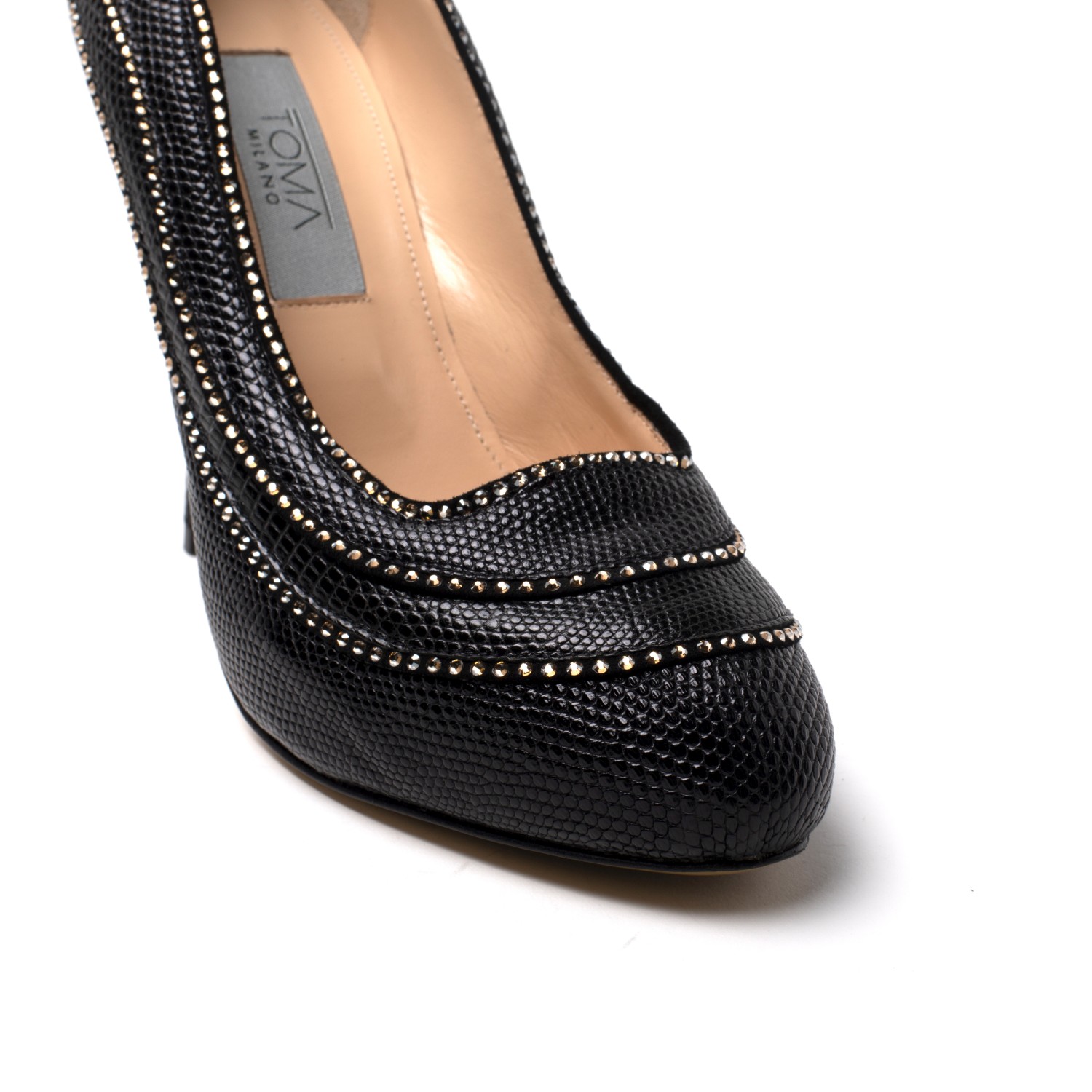 L’iconica creazione della Maison TOMA stile inconfondibile che riflette eleganza e femminilità, realizzata in pregiata pelle di varanus, si distingue per il disegno ad onde definite dalle linee luminose dei cristalli Swarovski. Punta arrotondata con plateau interno e tacco a stiletto. Made in Italy