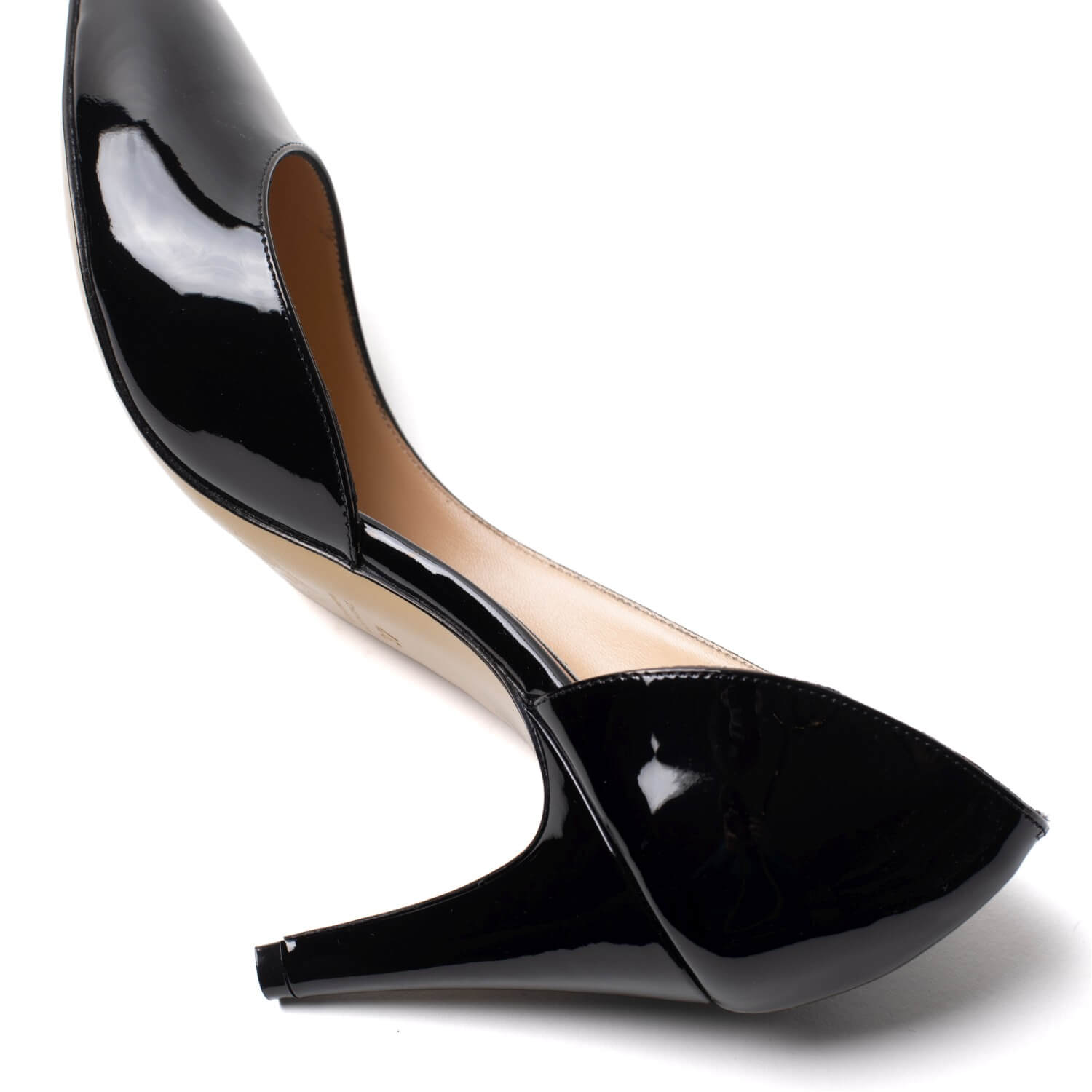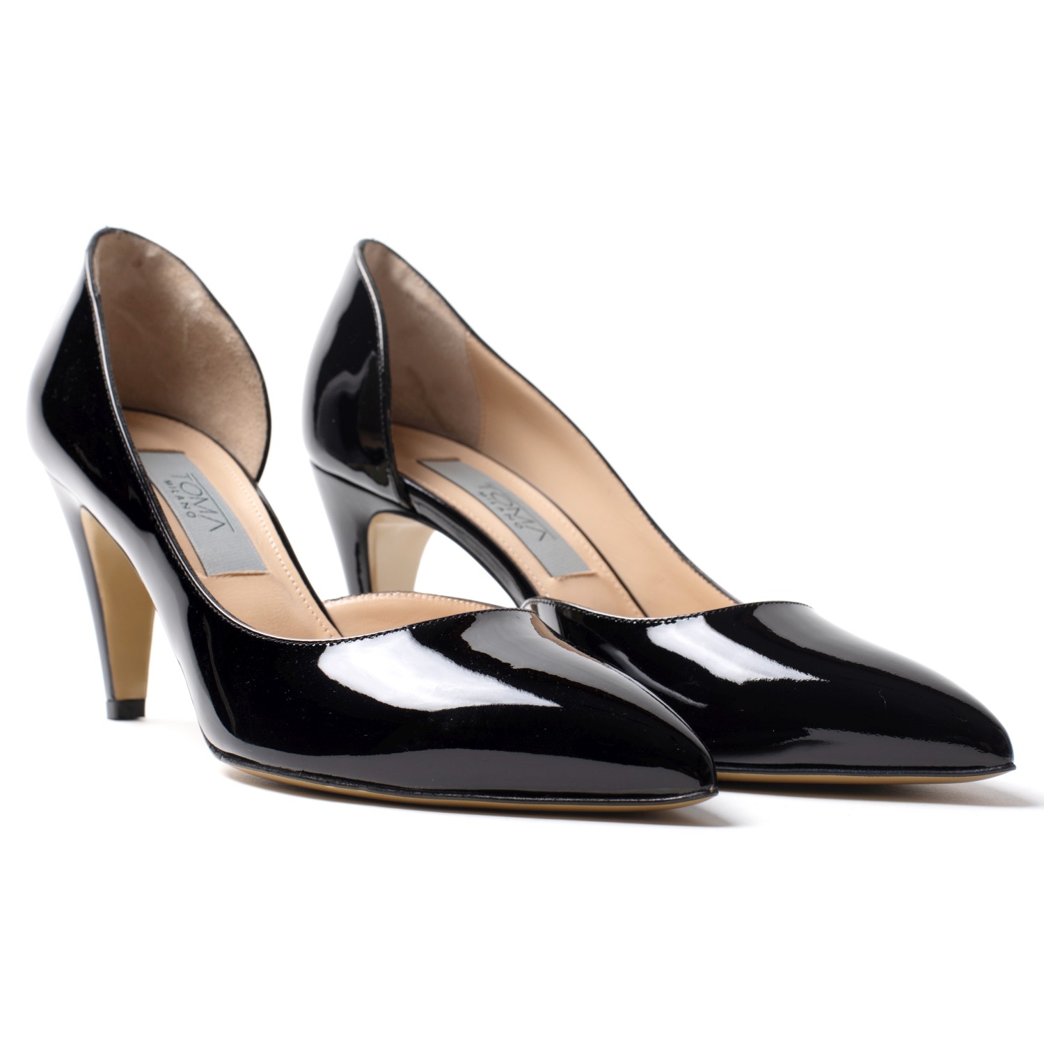 Eleganti, lucide e appuntite: le pumps d’Orsay vi accompagneranno con classe unica per molte stagioni a venire. Il modello è realizzato in lussuosa vernice con un tacco medio. Made in Italy.