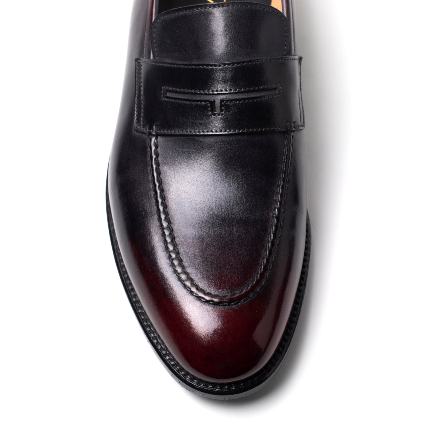 Mocassini con mascherina a T in pelle anticata a mano sfumata nel colore bordeaux. La suola in cuoio garantisce un comfort assoluto, per una calzatura da indossare quotidianamente. Made in Italy.