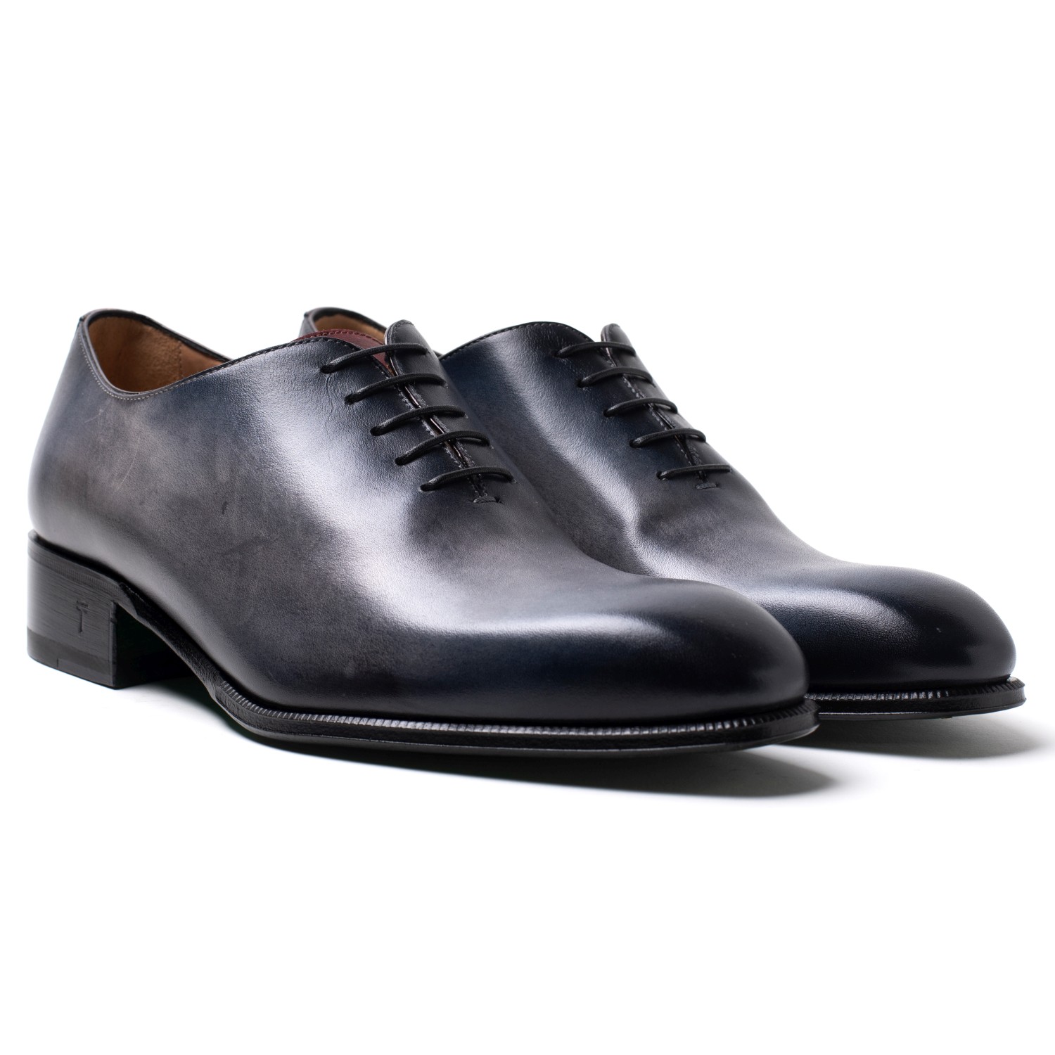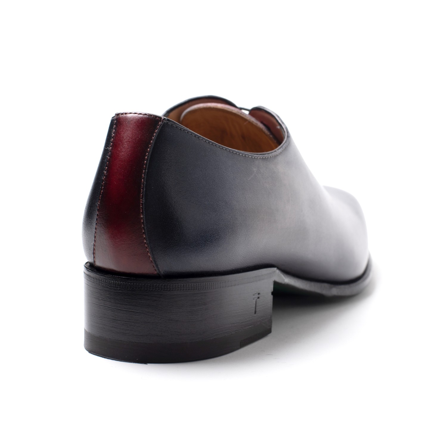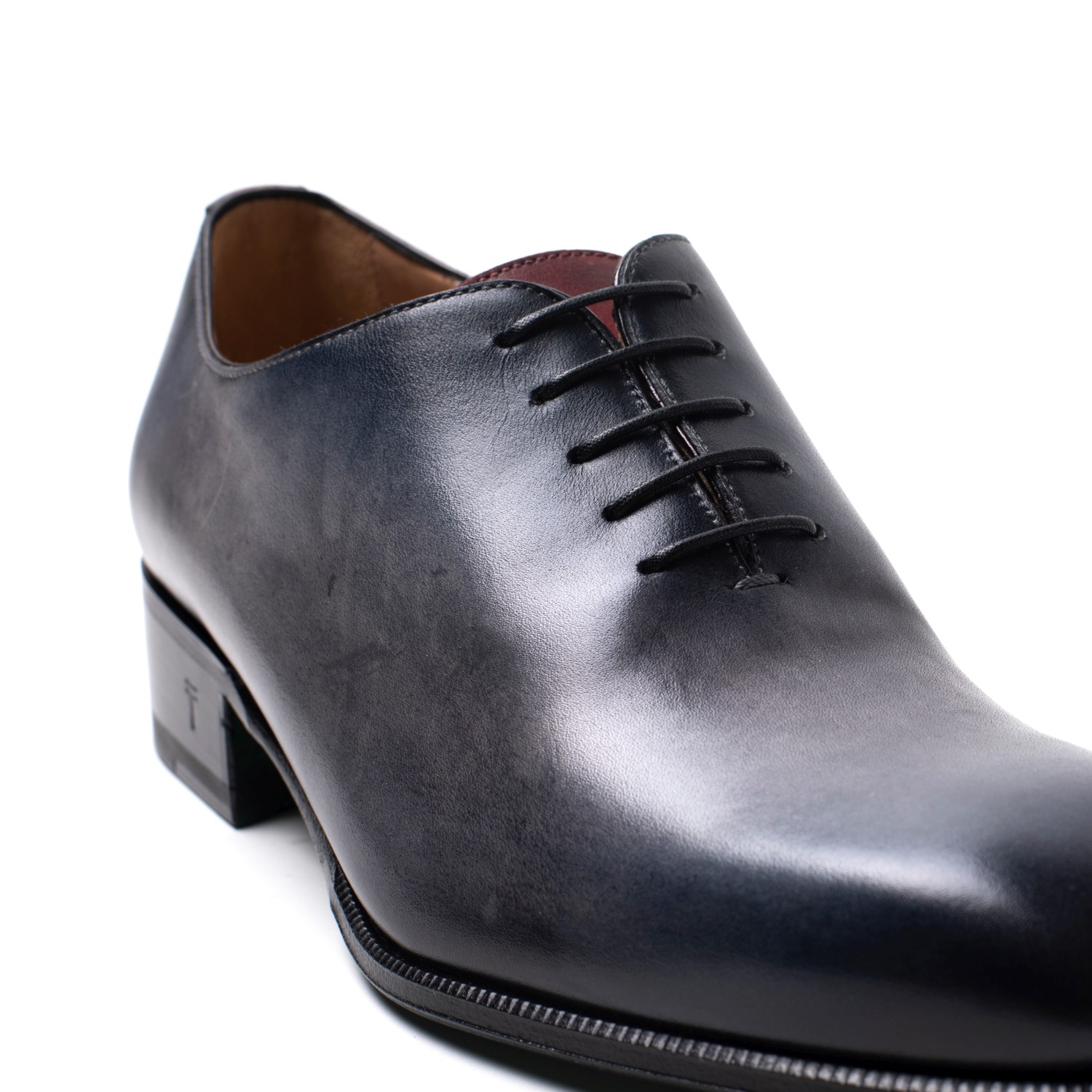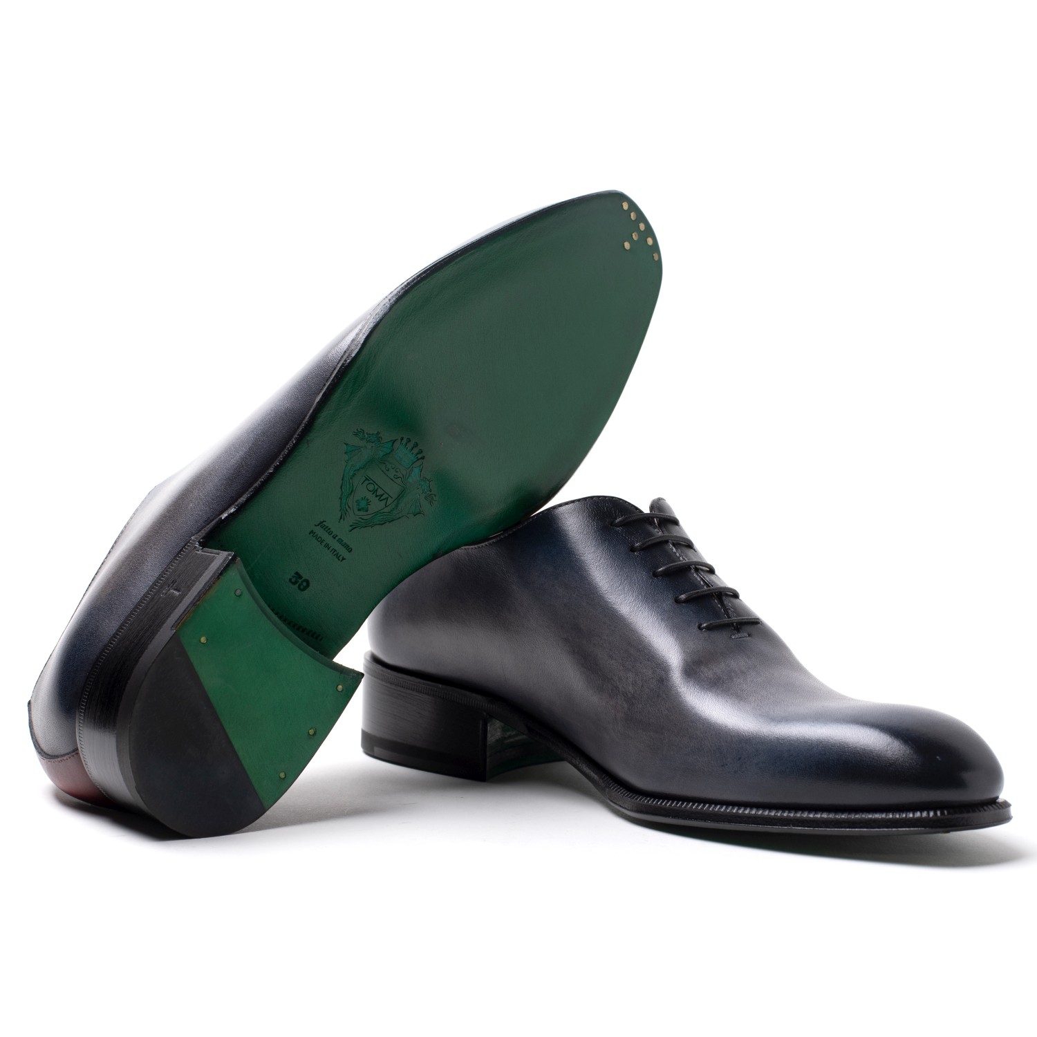 La oxford è proposta in pelle di vitello anticata e lucidata nelle tonalità del blu e rosso con effetto degradé, creato a mano dagli artigiani della Maison. Si distingue per il profilo grintoso. La suola in cuoio garantisce un comfort assoluto, per una calzatura da indossare abitualmente. Urban dandy. Made in Italy