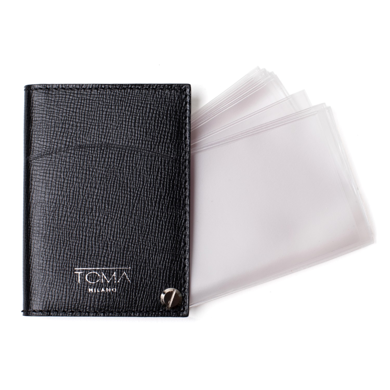 Questo organizer tascabile in pelle di vitello martellata, presenta numerosi scomparti per carte di credito.